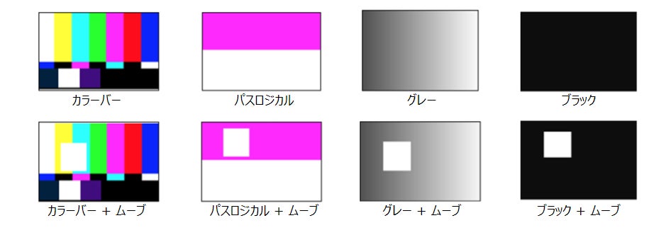 ムーブ信号を含む、SMPTEカラーバー/パソロジカル/グレー/ブラックの8種のテストパターン出力機能を搭載。X_TS_V3から出力されたテストパターンを用いて、ソースが無い環境やソースからの出力信号が不確定な場合でも、X_TS_V3に接続されたシンク機器へ信号出力が出来る為、現場での映像確認にすばやく対応します。