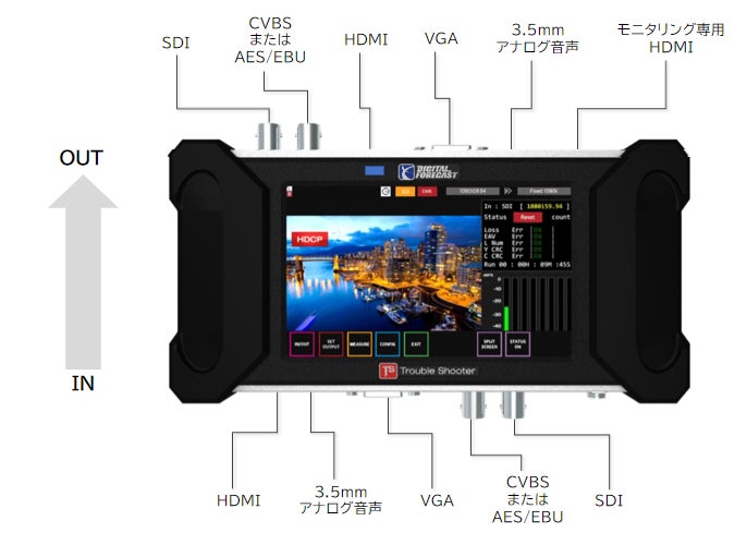 X_TS_V3へ入力されたSDI/HDMI信号情報を5型ワイド液晶へモニタリング表示します。入力信号のエラー情報や、HDMI信号のHDCP有無等の簡易的な信号情報の確認が行えます。
