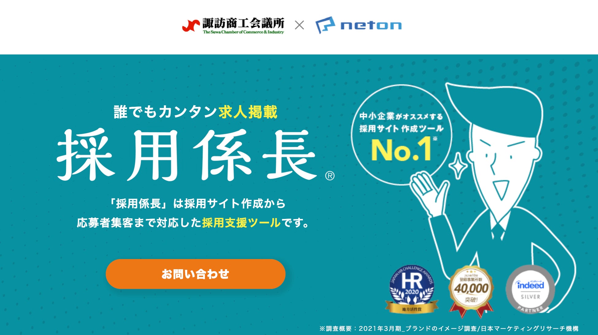 採用業務クラウド「採用係長」を開発・提供する株式会社ネットオン(本社:大阪市北区、代表取締役CEO:木嶋 諭、以下ネットオン)と諏訪商工会議所(長野県諏訪市)、諏訪市労務対策協議会(長野県諏訪市)は、採用課題を抱える長野県諏訪市内の中小企業の採用支援を目的として、採用係長利用料の一部を補助する制度を開始いたします。