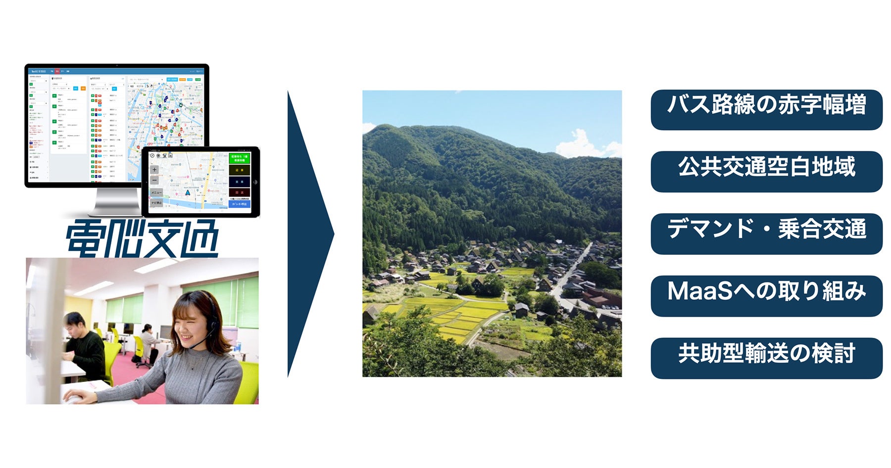 電脳交通では、自社開発したクラウド型タクシー配車システム「電脳交通®」の特性を活用し、予約型乗合タクシー運行管理機能が付いた配車システムをタクシー事業者さまへ提供し効率的で安定した運行を支えます。