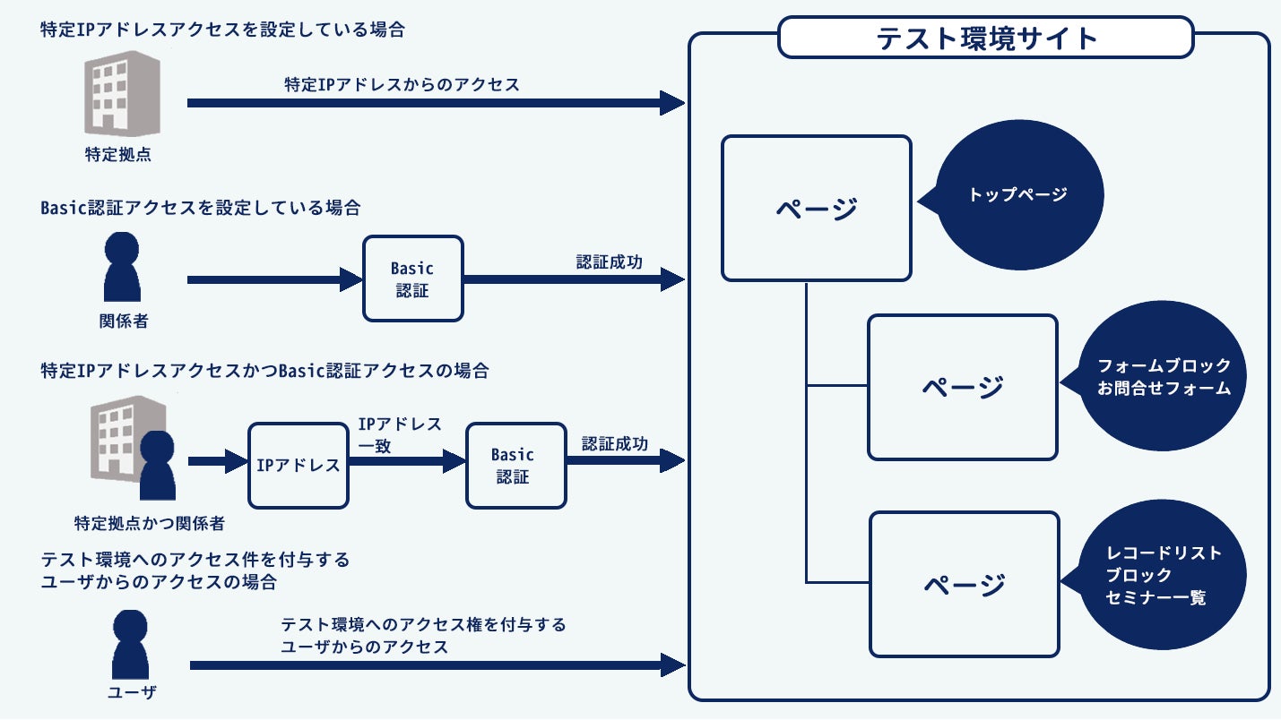 「SPIRAL ver.2」のサイト機能では、ページやフォームを安全に運用するためのテスト環境を用意しています。このたび、テスト環境へのアクセス権限を付与したユーザ以外もアクセスできるように機能拡張するとともに、テスト環境へのアクセスの際に指定したIPアドレスやBasic認証によるアクセス許可を併用することが可能になりました。これにより、例えば、Web制作会社様や開発会社様がクライアントとリリース前のサイトの動作確認を容易に行うことが可能になります。