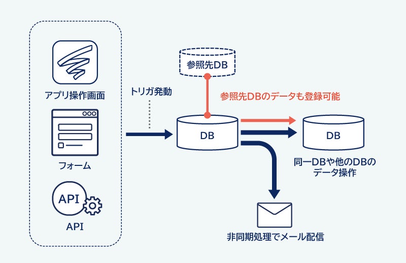 「SPIRAL ver.2」のアプリ機能において、複雑なデータ処理をノーコードで効率的に設定できるデータベースのトリガ機能を拡張しました。例えば、セミナー申込情報をデータベースに登録する際に、参照先のセミナーマスタデータベースのセミナー名や開催日時、会員データベースの会員属性などを申込データベースに登録が可能となります。プラットフォーム側でデータ処理が実行されるため、エラーハンドリングを気にせずに、スマートかつセキュアな開発および運用が可能になります。