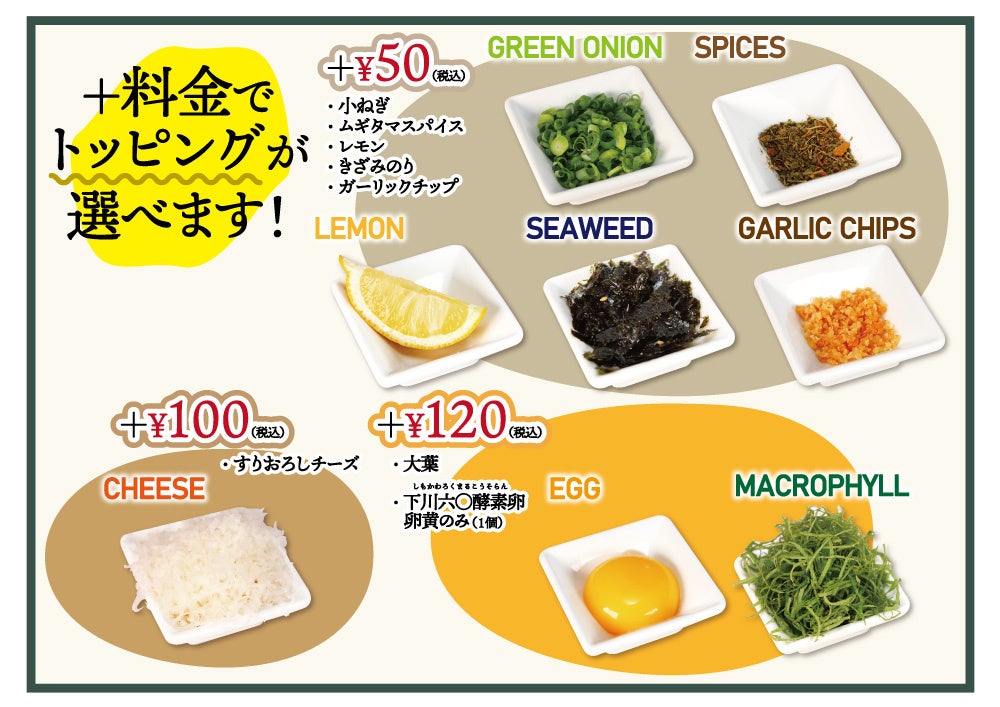 ●ムギタマスパイス ●レモン ●小ネギ ●きざみのり ●ガーリックチップス