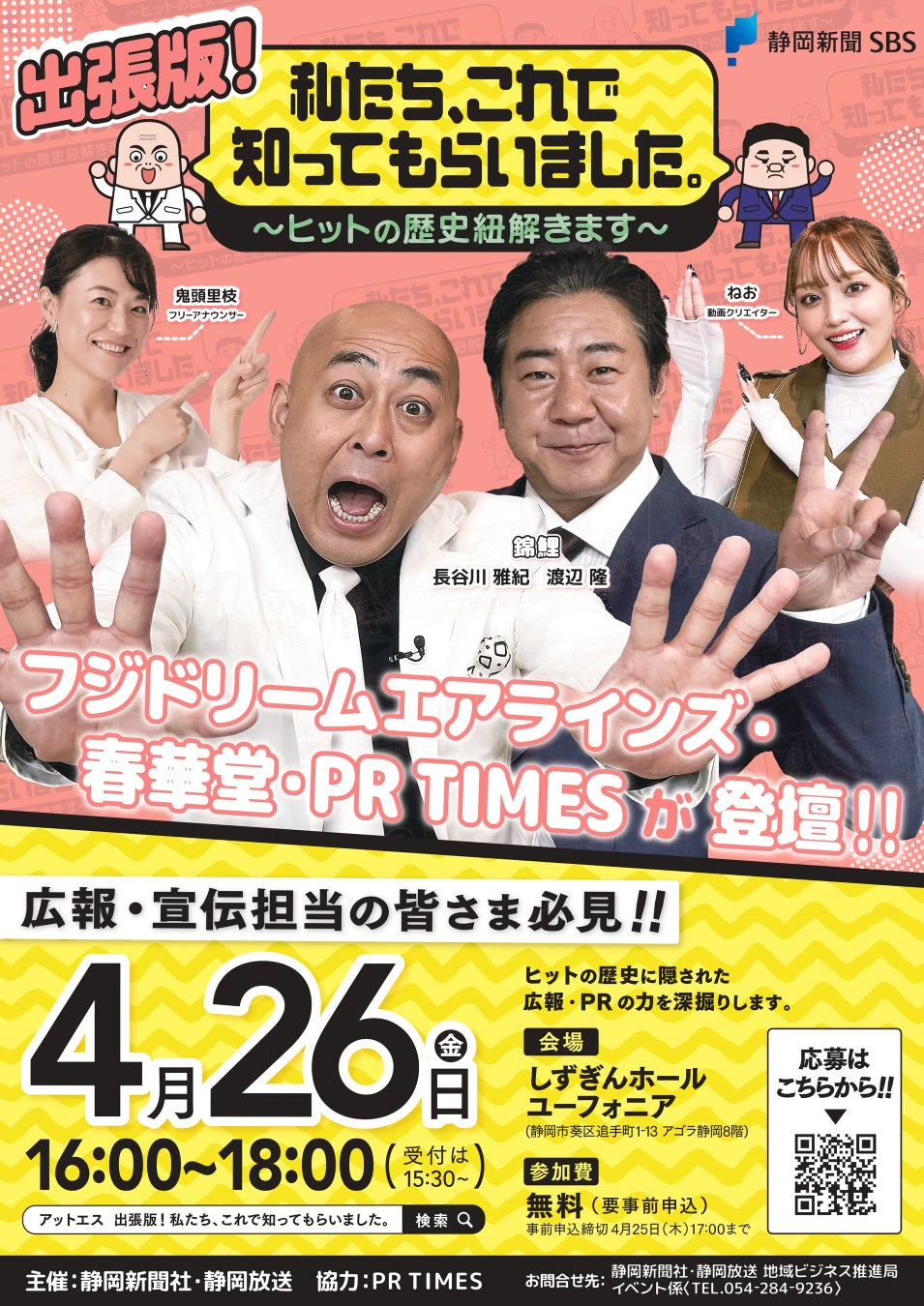 静岡新聞社・静岡放送では、2024年4月26日(金)16:00から、しずぎんホール‧ユーフォニア(静岡市)にて 「出張版!私たち、これで知ってもらいました。~ヒットの歴史紐解きます~」を開催します。