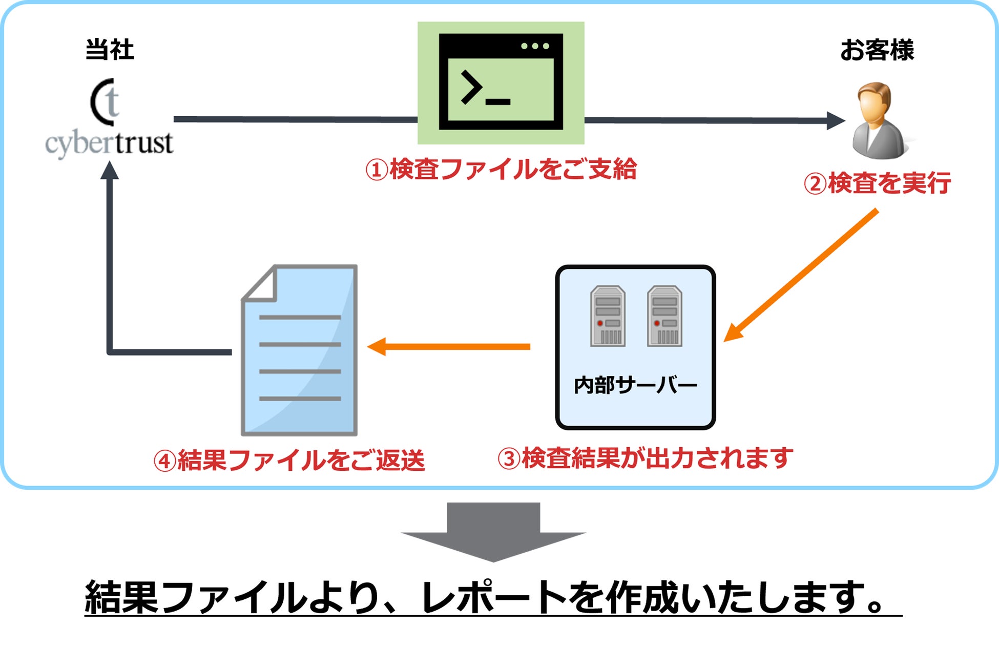 それらの課題を解決するためホスト診断では、現地訪問不要でお客様側に検査ファイルの提供を行い、返送いただく結果ファイルにもとづいてレポートを提供する方法を採用しています。これにより現地訪問のコストや、お客様側の負担を限りなく軽減した上で、内部ネットワークにおける脆弱性診断を可能にし、PCI DSS v4.0の必須事項である認証スキャンを実現します。