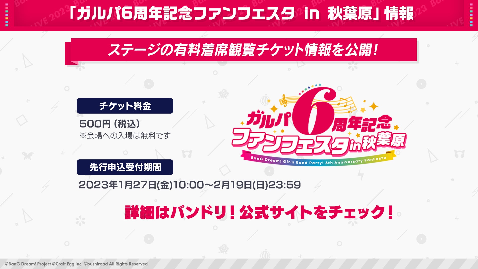 スマートフォンアプリの企画開発事業を展開する株式会社Craft Egg(本社:東京都渋谷区 代表取締役:森川 修一、以下、Craft Egg)と、株式会社ブシロード(本社:東京都中野区 代表取締役社長:木谷 高明、以下、ブシロード)の共同制作によるスマートフォン向けゲーム「バンドリ! ガールズバンドパーティ!」(以下、ガルパ)は、2023年1月26日(木)の「バンドリ!TV LIVE 2023 #152」にて、「ガルパ6周年記念ファンフェスタ in 秋葉原」のステージ情報などの詳細情報について発表いたしました。