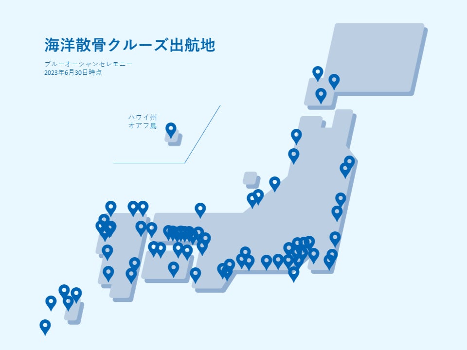 実際に、2019年度には全体の海洋散骨実施件数のうち約77.8%が東京での実施、残りの約22.2%がその他の地域であったのに対し、2022年度は東京での実施が約58%、その他の地域が約42%と東京以外での海洋散骨のご希望が急速に増加いたしました。このような状況を受け、今期はさらに海洋散骨クルーズの出航地を拡大し、お客様のご希望のエリアで実施ができるよう取り組んだ結果、2023年2月1日~2023年6月26日の間に新たに26ヵ所の出航地から海洋散骨の実施が可能となりました。