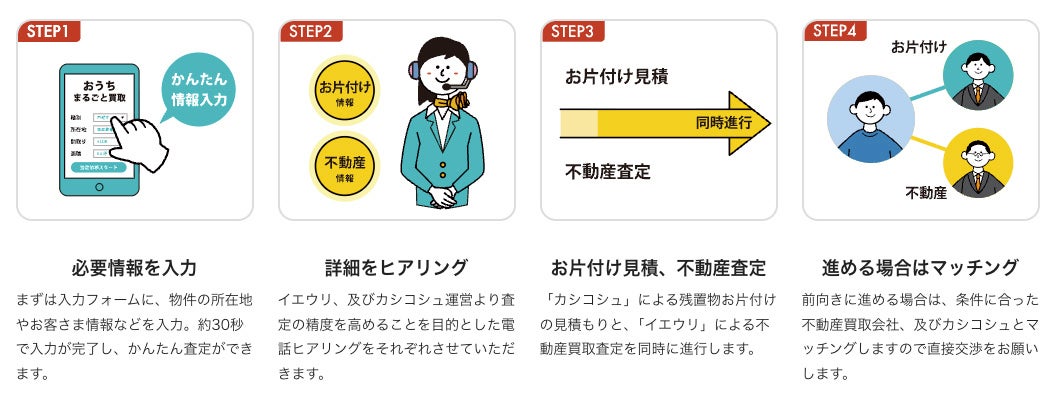 本サービスは、不動産売却と家財整理を一括で行えるワンストップサービスです。「イエウリ」が家・土地など不動産の買取査定を行うと同時に、「カシコシュ」が家具・家電・日用品・遺品などの動産について、お片付け・処分・買取を含めた見積もりを実施します。複数の業者へ個別に依頼する必要がなく、窓口ひとつで住まいと家の中のものをまとめて手放すことができるため、空き家や相続物件などの売却に伴う手間や精神的負担を大幅に軽減します。