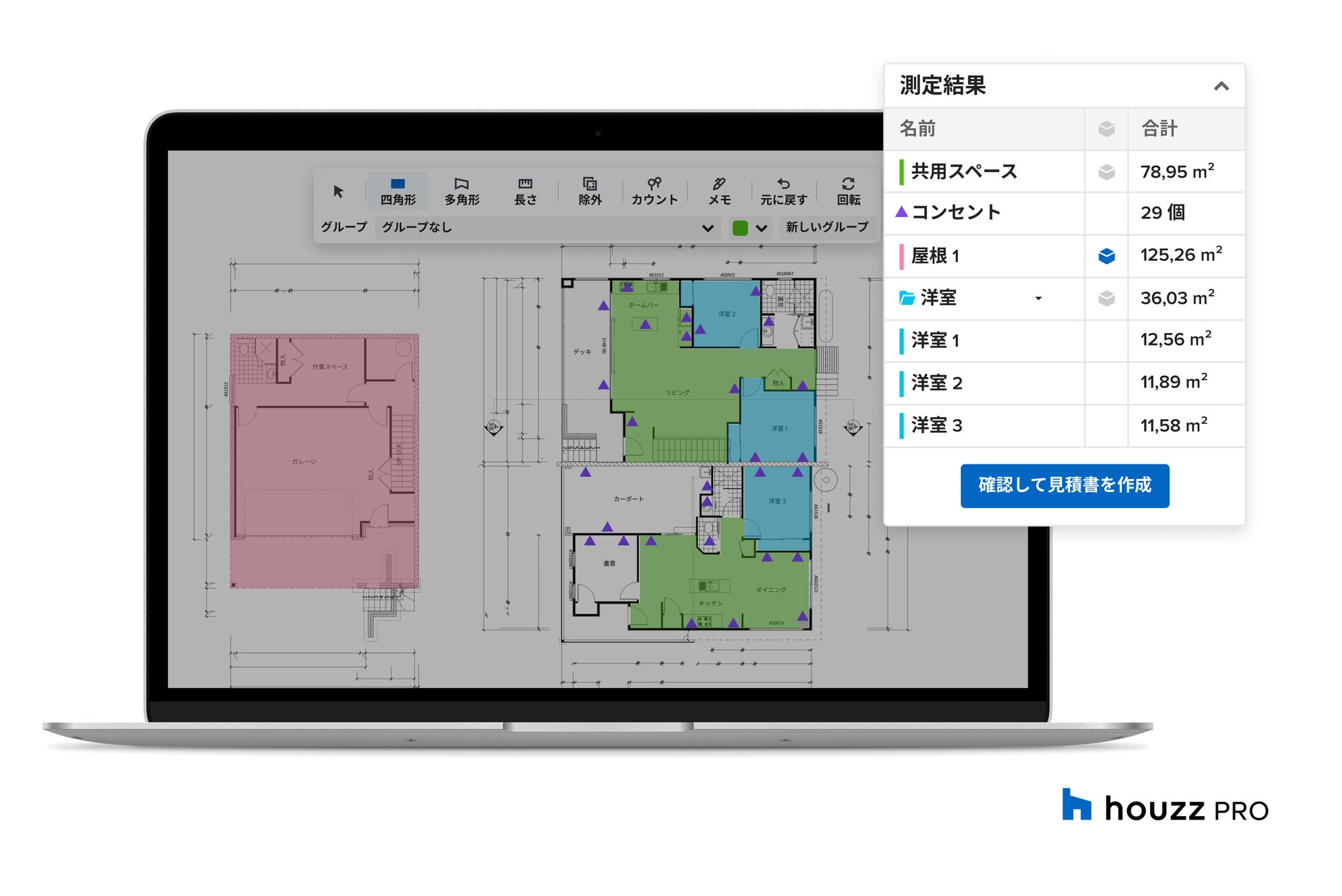 世界最大級の家づくりとインテリアデザインのプラットフォームを提供する Houzz Japan 株式会社(https://www.houzz.jp 以下 Houzz)は、マーケティングと業務効率化の統合型ソフトウェアである Houzz Proに、本日、「積算ツール」をリリースしました。このツールにより、画面上で図面から簡単に積算し、デザイン性の高い正確な見積書を最大10倍速く作成することができます。