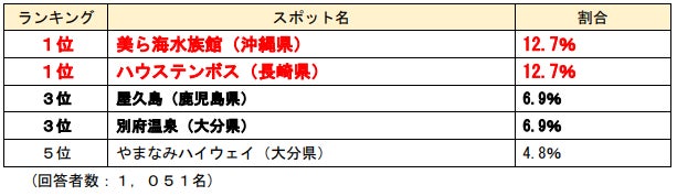 九州・沖縄地方で人気のドライブの行き先は1位が同率で「美ら海水族館(沖縄県)」と「ハウステンボス(長崎県)」、3位が同率で「屋久島(鹿児島県)」と「別府温泉(大分県)」でした。