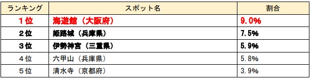 近畿地方で人気のドライブの行き先は1位が「海遊館(大阪府)」、2位が「姫路城(兵庫県)」、3位が「伊勢神宮(三重県)」でした。