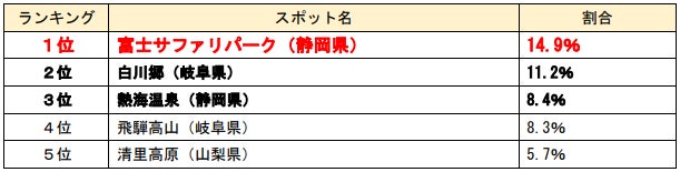 中部地方で人気のドライブの行き先は1位が「富士サファリパーク(静岡県)」、2位が「白川郷(岐阜県)」、3位が「熱海温泉(静岡県)」でした。