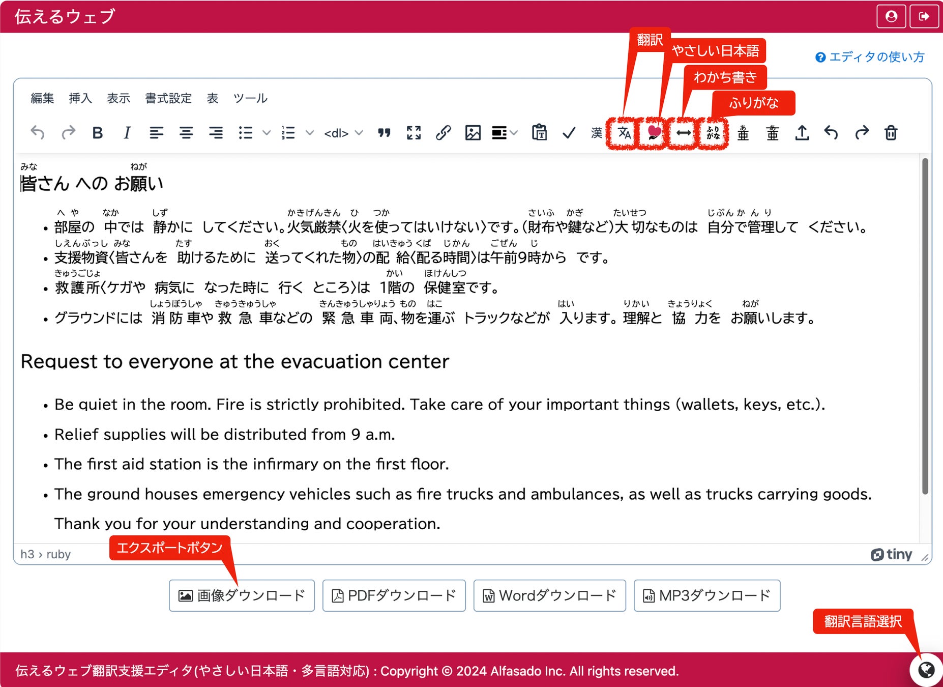 1月10日に当社よりリリースを行いました、「伝えるウェブ翻訳支援エディタ」 につきましても、引き続き無償にてお役立ていただけます。こちらは「やさしい日本語」化機能のほか70言語以上の多言語翻訳に対応しております。外国人住民への情報発信など、文書作成の一選択肢としてぜひご利用ください。