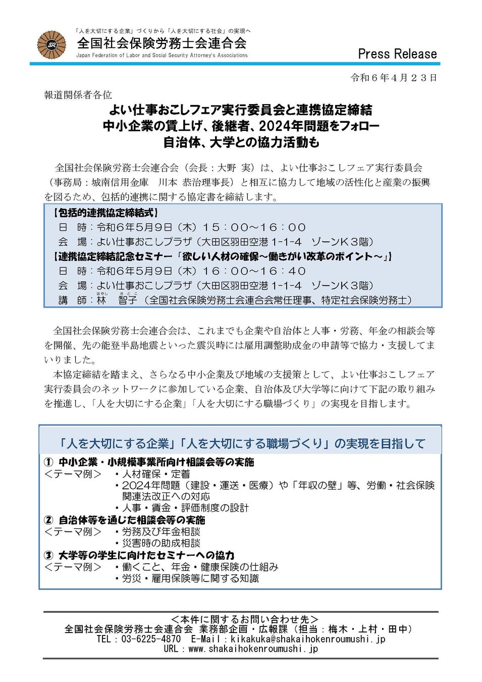 全国社会保険労務士会連合会(会長:大野 実)は、よい仕事おこしフェア実行委員会(事務局:城南信用金庫 川本 恭治理事長)と相互に協力して地域の活性化と産業の振興を図るため、包括的連携に関する協定書を締結します。
