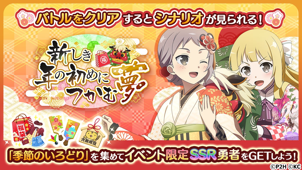 シナリオ限定SSRとして安芸真鈴(CV:田澤 茉純)、乃木園子(CV:花澤 香菜)が手に入るイベントを開催! 年越しにぴったりなお話なので、ぜひ勇者たちと一緒に年を越してくださいね。