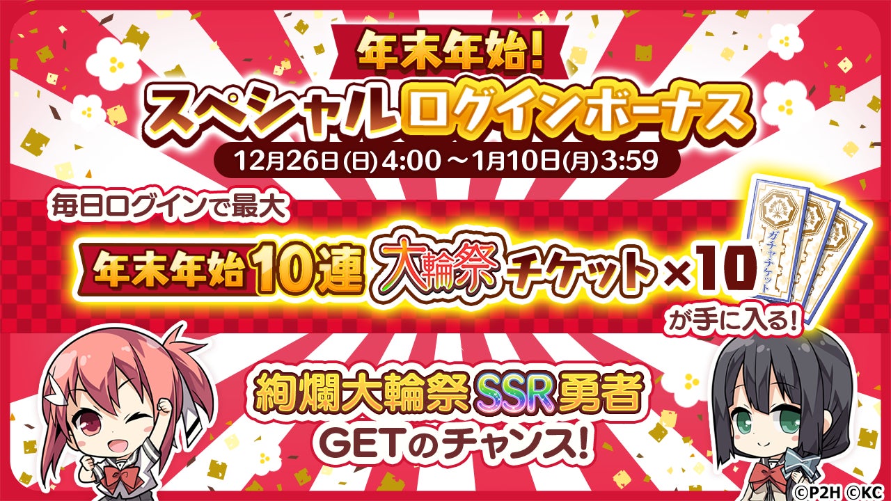 このチケットで引ける「年末年始10連大輪祭チケットガチャ」には絢爛大輪祭勇者も登場しますので、ぜひアプリにログインしてチケットを手に入れて下さいね。