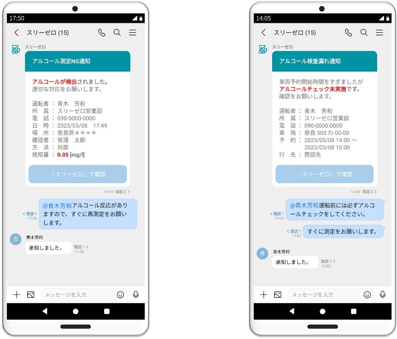 (左:LINE WORKSへの測定NG通知 右:LINE WORKSへの検査漏れ通知)