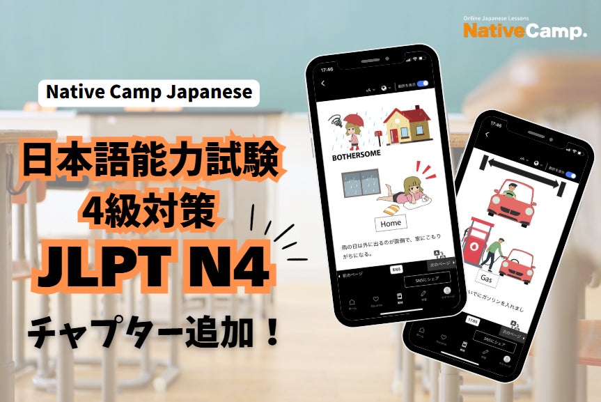 株式会社ネイティブキャンプ(本社:東京都渋谷区、代表取締役社長:谷川国洋)が提供するオンライン日本語会話サービス『Native Camp Japanese』は、日本語学習教材「日本語能力試験4級対策(JLPT N4)」に新たにチャプターを追加いたしましたことをお知らせいたします。
