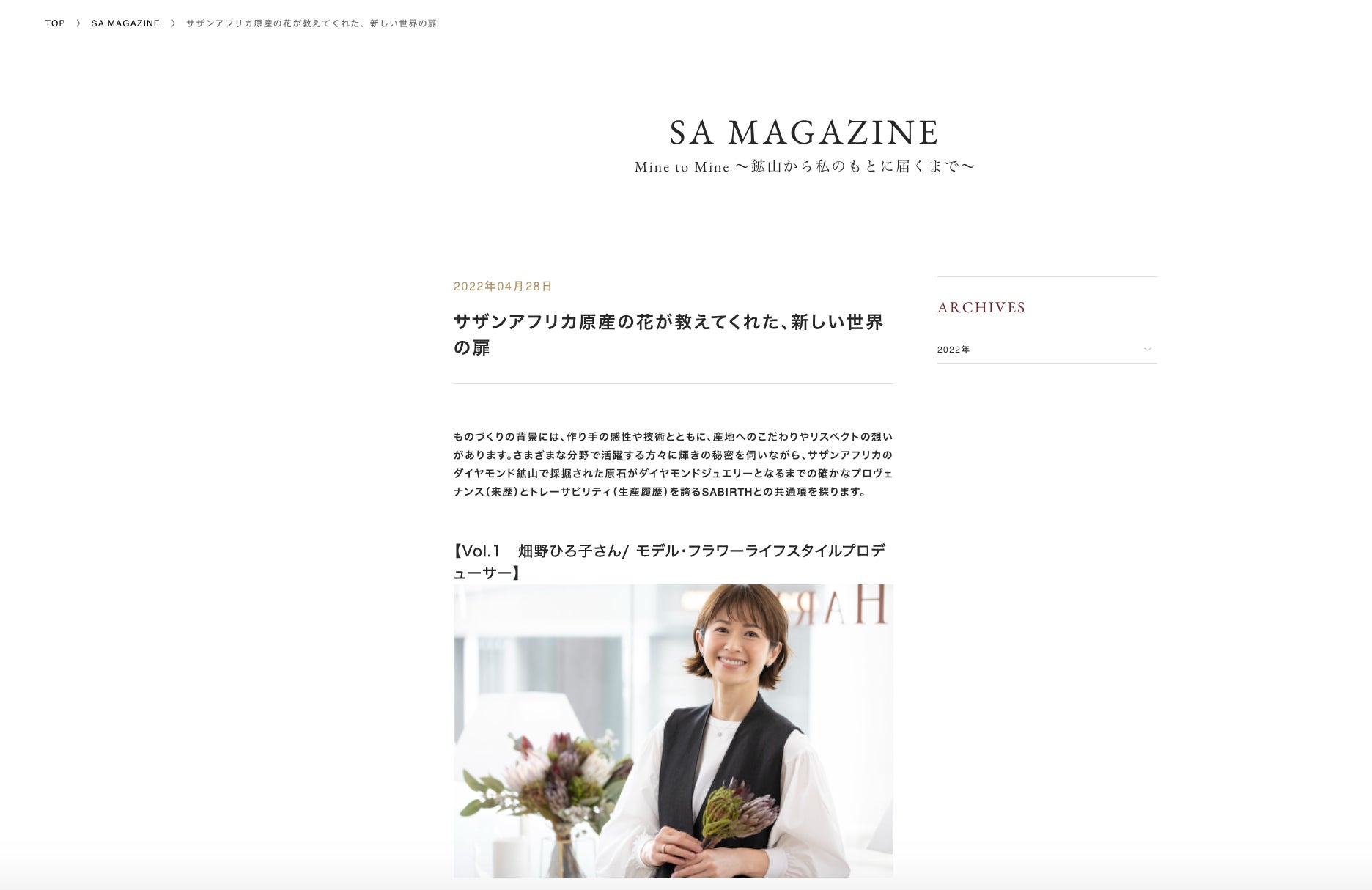 Vol.1 は、モデルであり、フラワーライフスタイルプロデューサーの畑野ひろ子さん。フラワーライフプロデューサーとして活動を始めたきっかけや、畑野さんが愛する、サバースと同じサザンアフリカ由来のネイティブフラワーの魅力、彼女にとってのジュエリーについてを中心に幅広く語って頂きました。