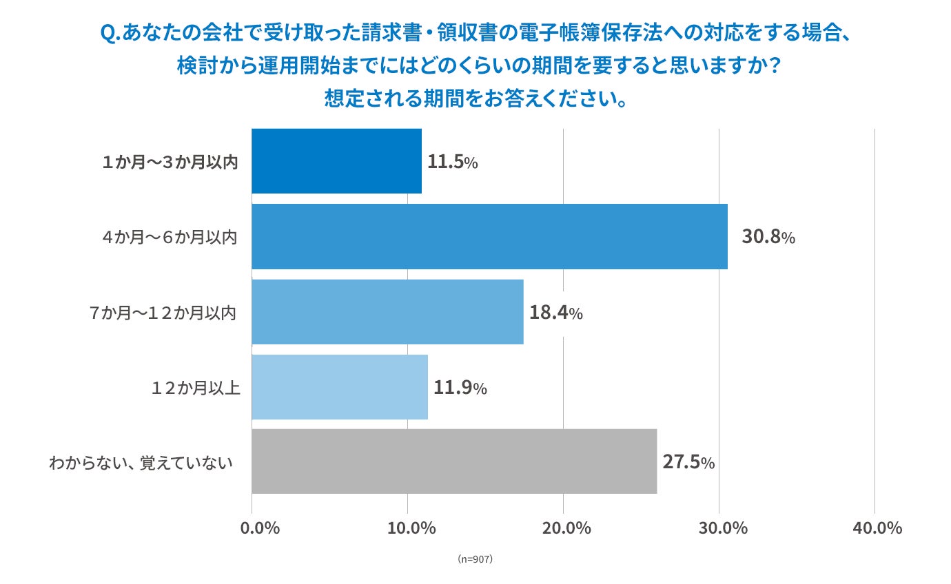 受け取った請求書・領収書の電子帳簿保存法への対応をする場合、検討から運用開始までにはどのくらいの期間を要すると思うかを調査したところ、「4~6か月以内」と回答した企業が30.8%となり最多回答となりました。次いで「7~12か月以内」と回答した企業が18.4%、「12か月以上」と回答した企業が11.9%、「1~3か月」と回答した企業が11.5%という結果となっています。
