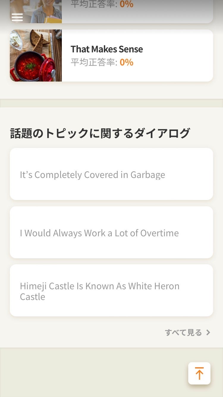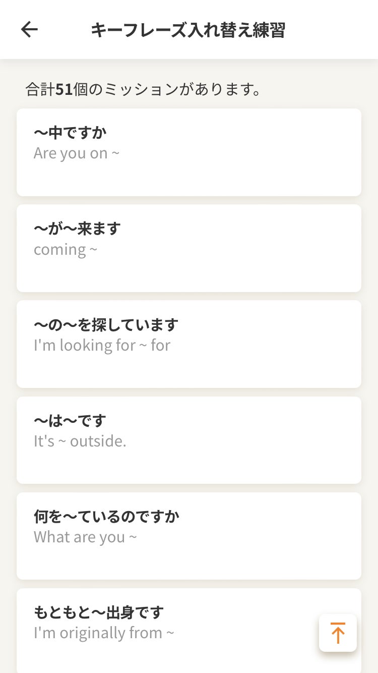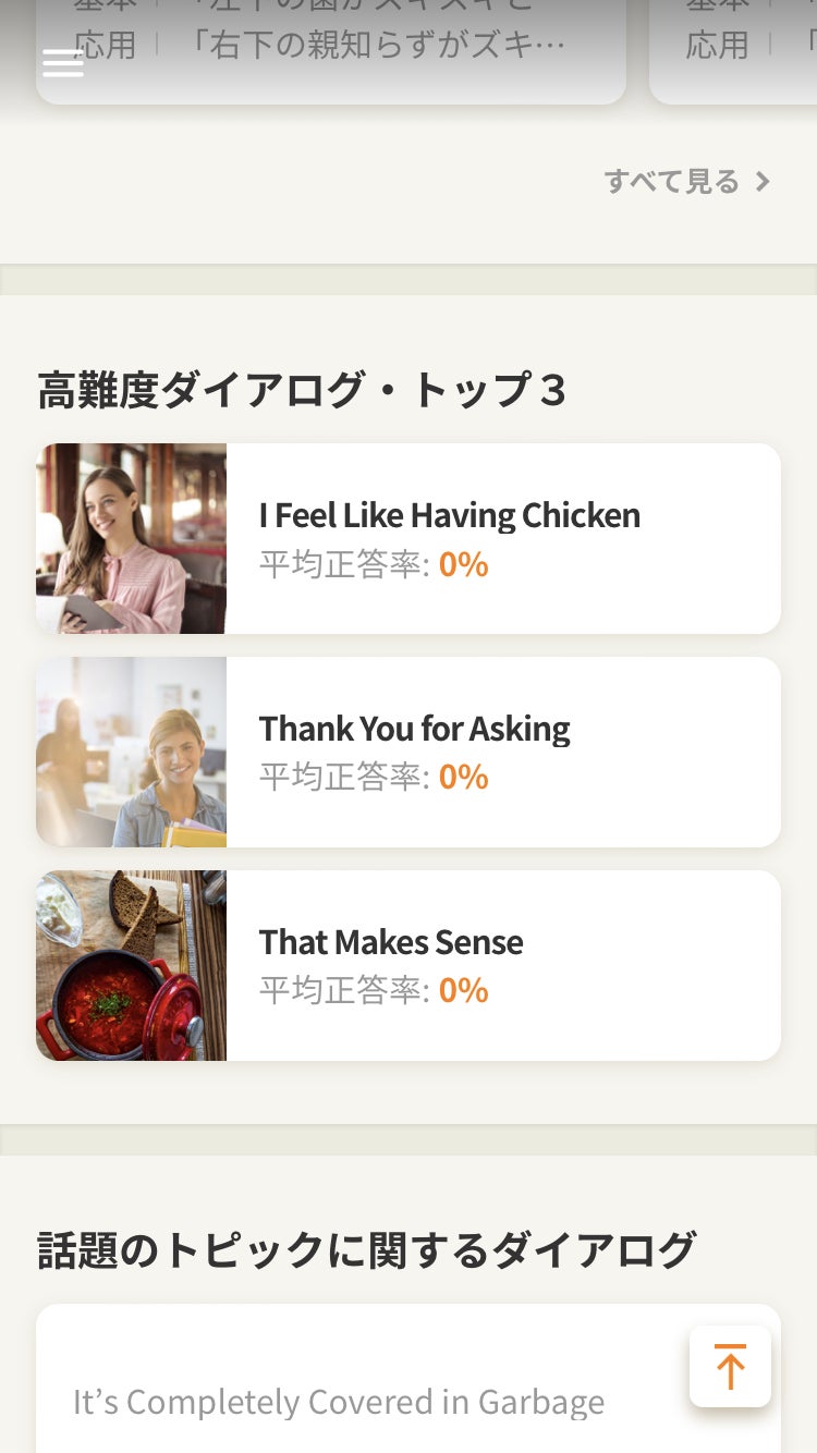 | ・短いシチュエーション毎のダイアログ練習だけでなく、「日常英会話」「ビジネス英会話」の2テーマで、「朝起きてから寝るまで」「クライアントと会い交渉、その後会議でプレゼンをする」というような、実生活に即した会話の流れを練習できる「連続したシーンでの英会話学習」機能を追加 ・ユーザーからの要望の多かった「人気ダイアログ・トップ3」「トピック別表現」等も選択可能に ・ワンタッチで学習開始できる、ユーザーへのおすすめダイアログが表示される等、ユーザビリティを向上 |