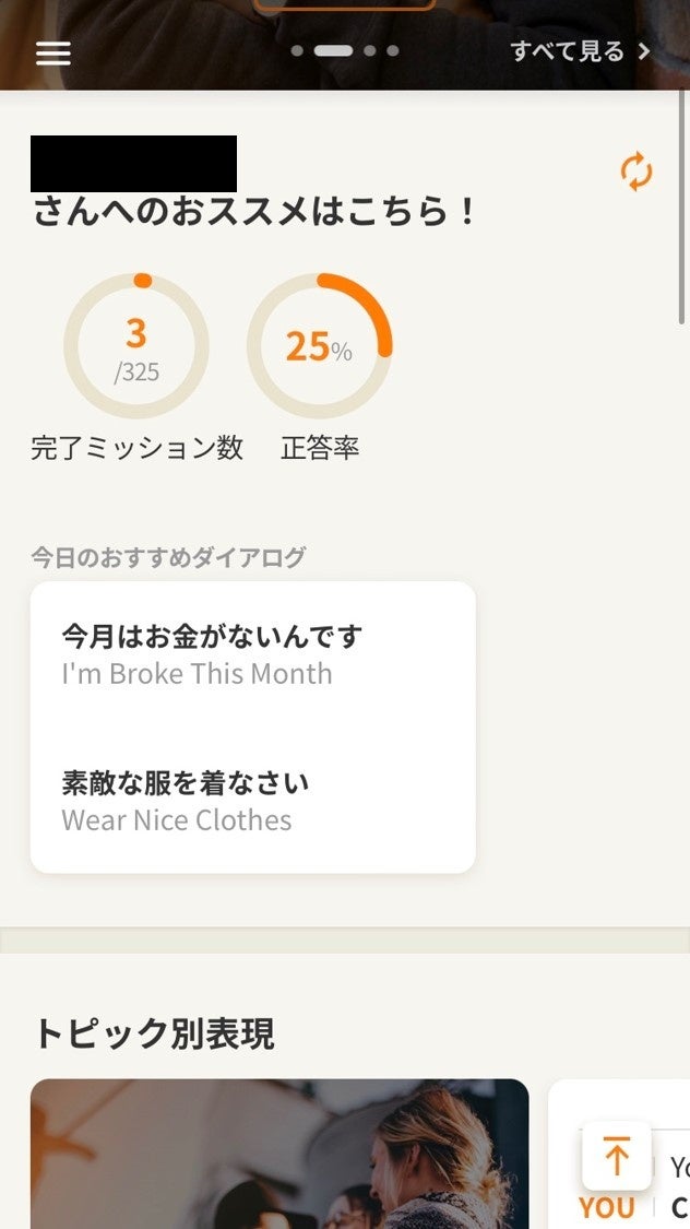新たに練習できるようになった「連続したシーンでの英会話学習」は、例えば日常英会話では、起床してから夜ベッドに入るまでの10シーンのダイアログを連続して学習することができます。「朝、家族を起こし、自身もオフィスへ出勤。職場で同僚や上司と業務などについて会話をし、退社後に自宅で家族にその日の出来事を話す」という1日の流れを、ユーザー自身が主人公になりきって、一気に学ぶことができます。ビジネス英会話では、クライアントを空港まで迎えに行くシーンや、同僚との会話、契約交渉、オンラインミーティング、プレゼンなどのシーンで使用される表現が練習できるようになっています。その他、人気のダイアログを選び学習することや、興味関心のあるトピックを中心に学習することもできるようになりました。