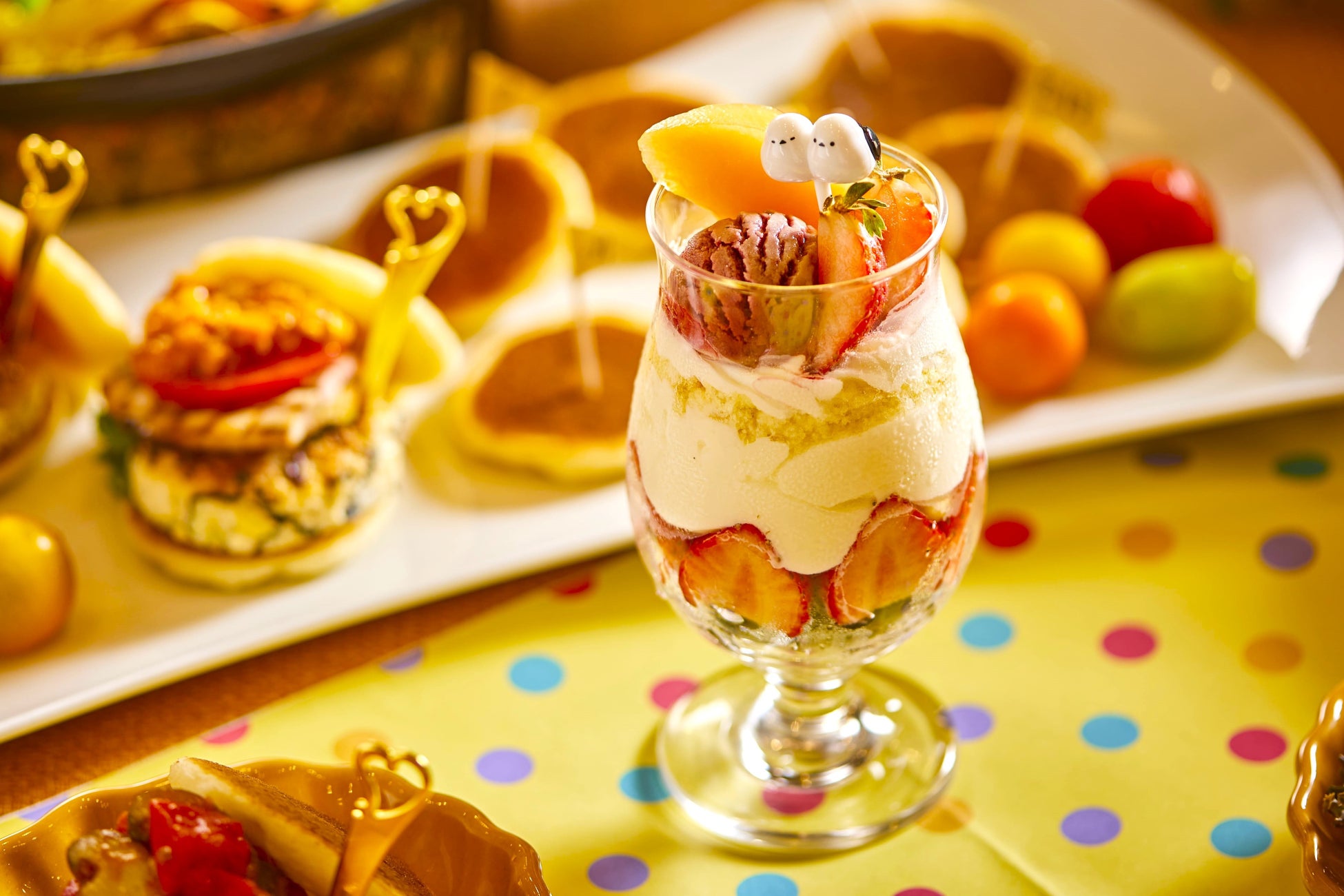 食育教室で学ぶ「バランス良く食べる」を実践できる、本イベント限定のスペシャルランチブッフェをご用意いたしました。豆腐とフルーツトマトのカプレーゼや玄米を使用したパエリア、仙台麩と北海道産チーズを使用したクリームグラタンなど、健康な身体作りをサポートする食材を使用したメニューがずらりと並びます。さらに、自分でお好みの具材を挟むパンケーキバーガーと、豆乳プリンにフルーツなどをトッピングして作るオリジナルパフェのコーナーもご用意いたします。皆で食事をする楽しさを感じていただくことはもちろん、様々なメニューが並ぶ中で栄養の偏りなく料理を選ぶ練習の場となることも目指しています。