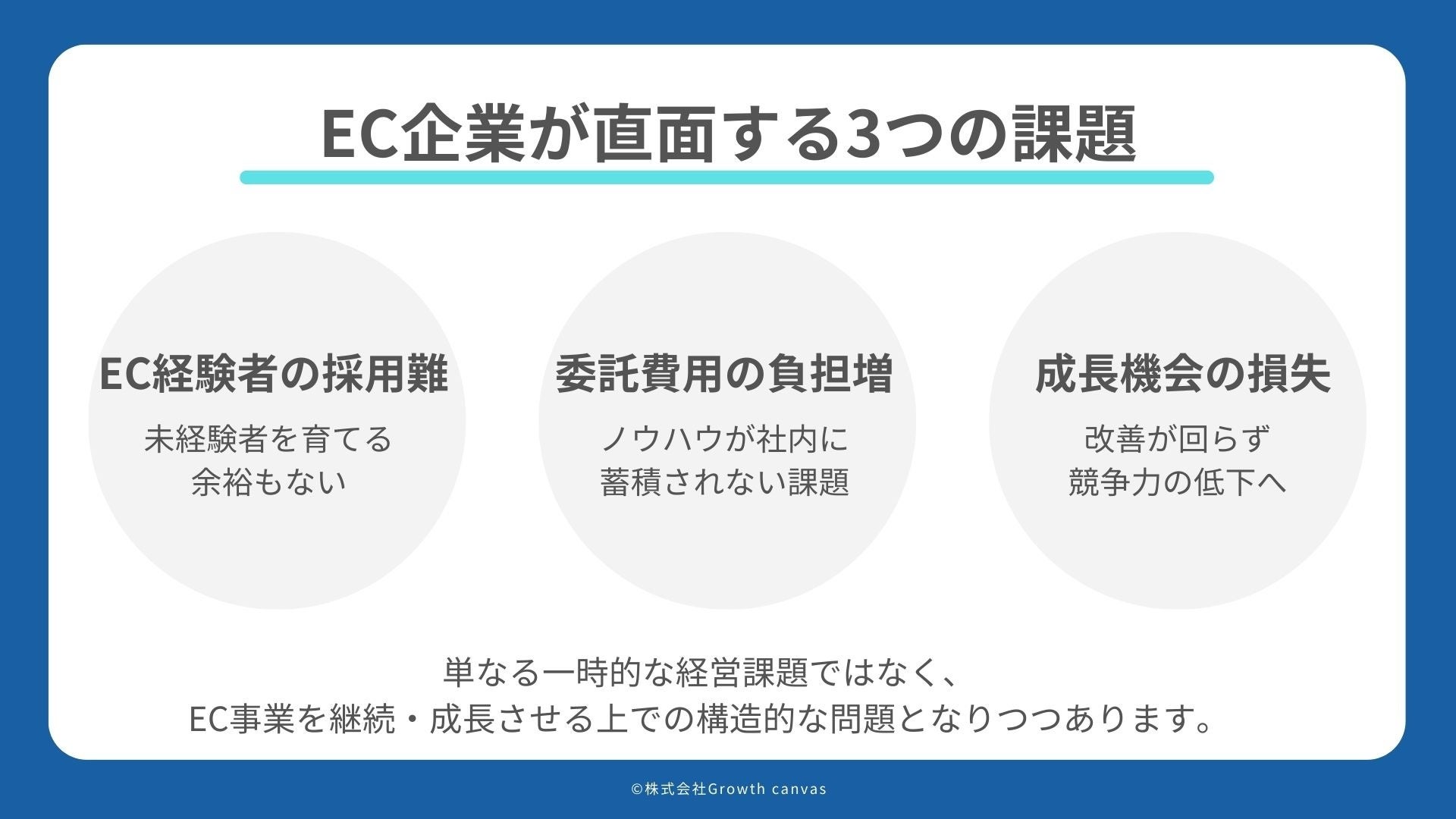 現在、拡大を続けるEC市場の裏側で、多くの企業が構造的な課題に直面しています。それは、実務経験者の採用難と、それに伴う「外注依存による利益率の圧迫」です。