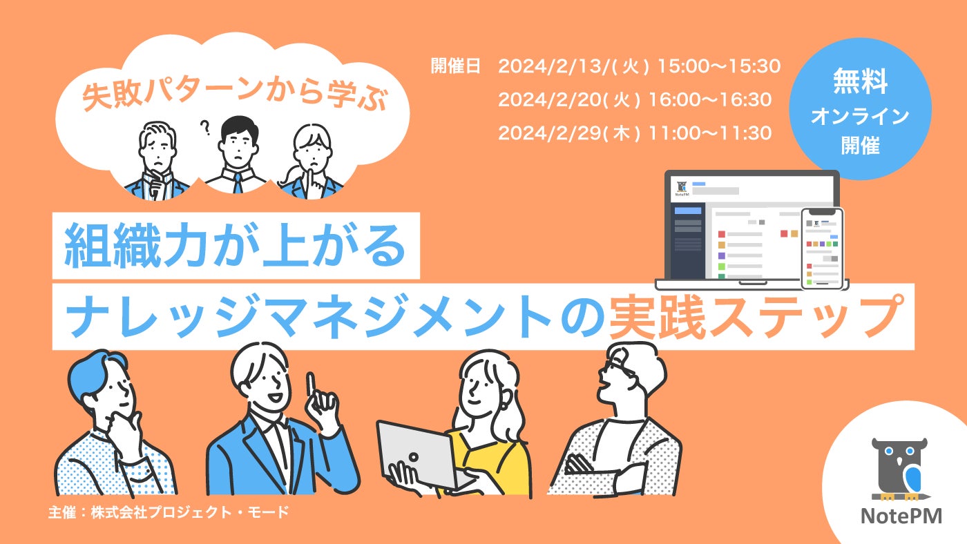 株式会社プロジェクト・モードが提供するナレッジマネジメントSaaS「NotePM (https://notepm.jp)」は、オンラインセミナー『失敗パターンから学ぶ!組織力が上がるナレッジマネジメントの実践ステップ』を開催いたします。