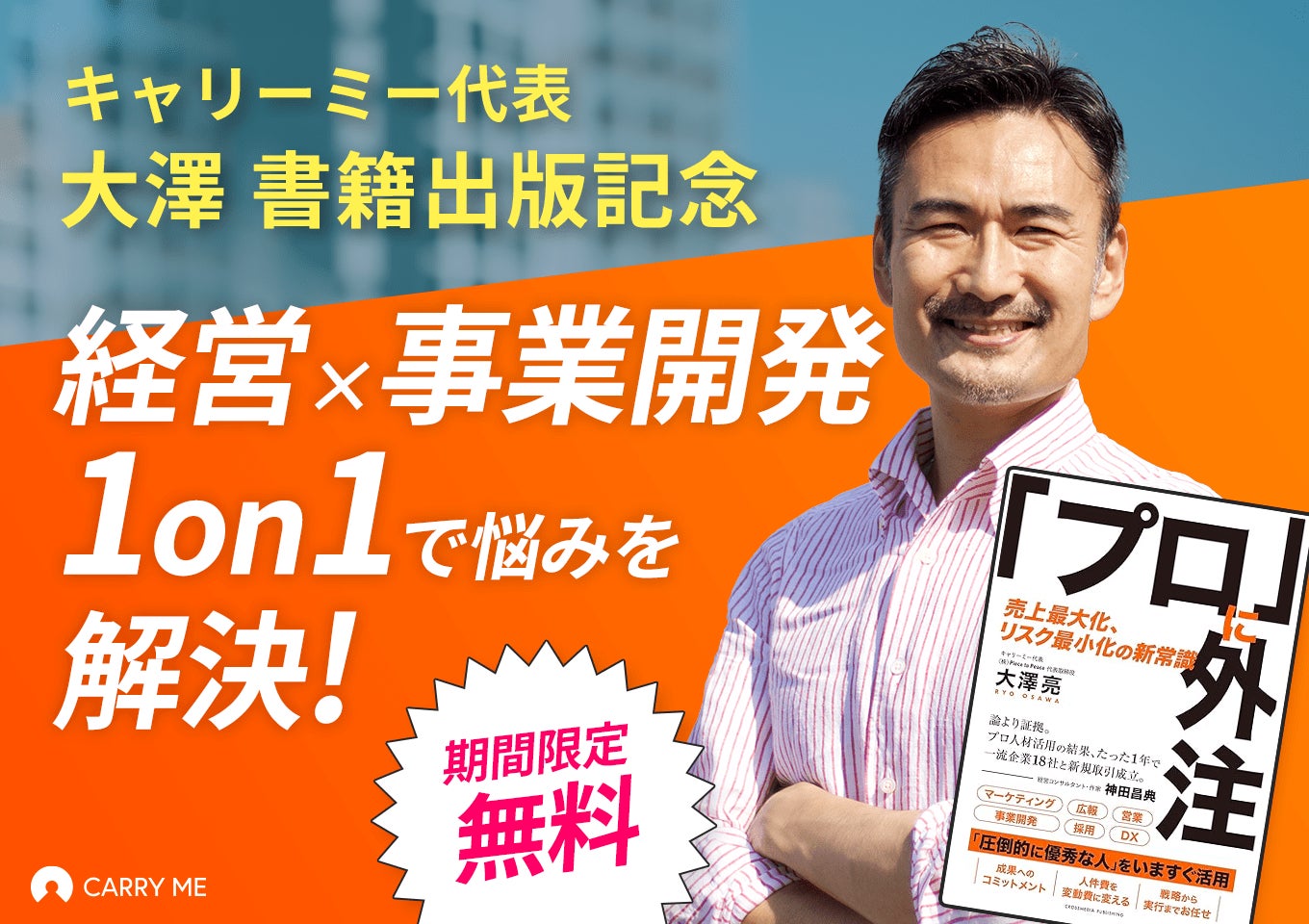 マーケティング領域を中心に活躍する業務委託の「プロ人材」と企業とのマッチングサービスを行うキャリーミー(https://carryme.jp/agent/)を運営する株式会社Piece to Peace(本社:東京都千代田区、代表取締役:大澤亮)は、キャリーミー初の書籍『「プロ」に外注』出版記念として、大澤が皆様の経営課題に直接お応えする1on1を企画いたしました。