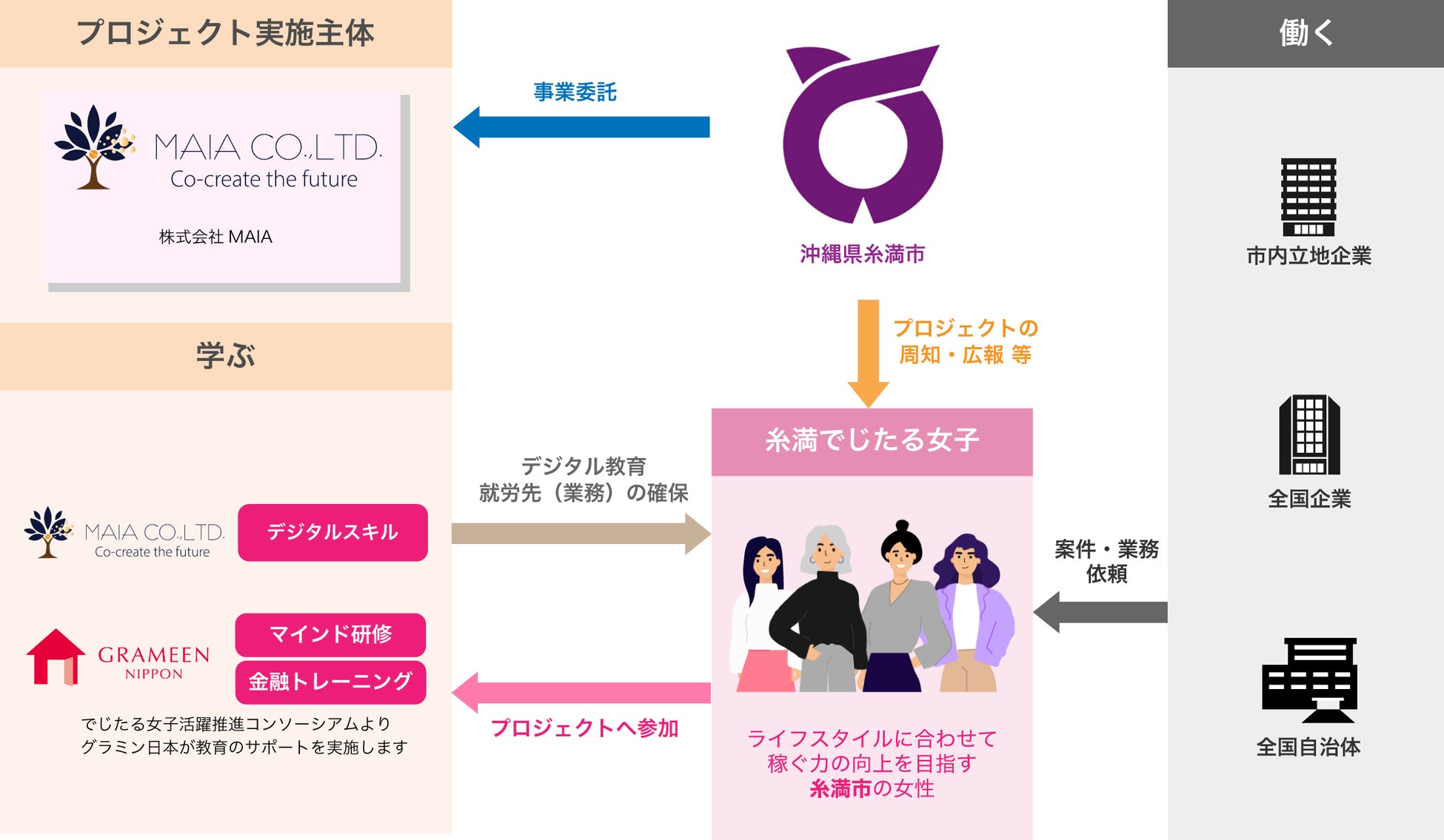 同事業は糸満市在住の女性を対象に、デジタル教育を実施し、就労支援まで一気通貫でつなげる「糸満でじたる女子プロジェクト」として、取り組んでいきます。