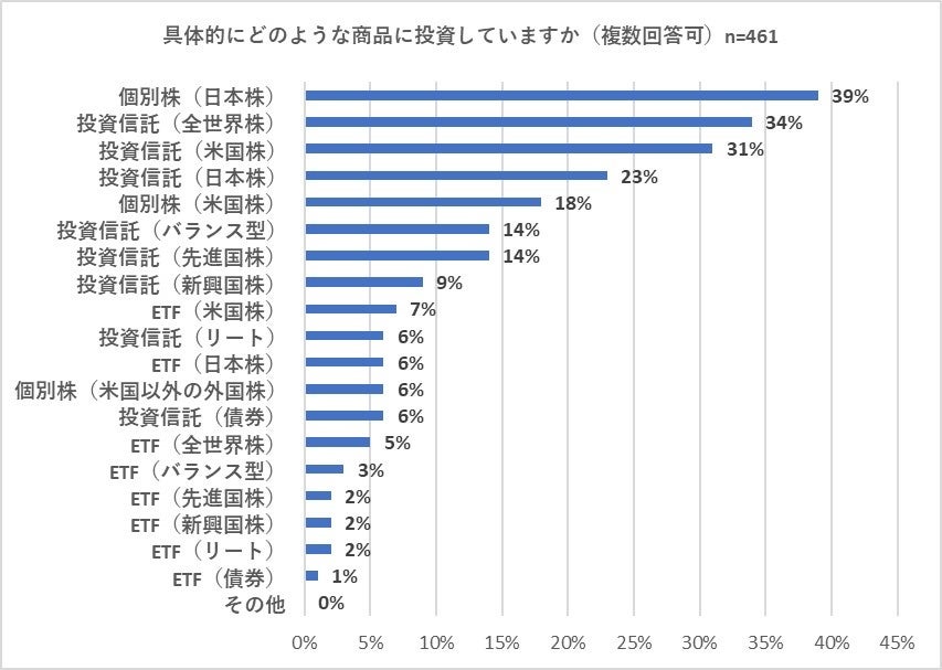 続いて、先の質問で「つみたて投資枠」、「つみたて投資枠と成長投資枠を併用」、「成長投資枠」と回答した461名(実際に新NISAで投資を行っていると回答した方)に対し「具体的にどのような商品に投資していますか」と複数回答可で質問しました。その結果、「個別株(日本株)」が39パーセントとなり、前回トップの「投資信託(米国株)」と前回2位の「投資信託(全世界株)」を抜いてトップとなりました。「個別株(日本株)」、「投資信託(全世界株)」、「投資信託(米国株)」のトップ3は前回も今回も30パーセント以上と多くの回答を集めています。