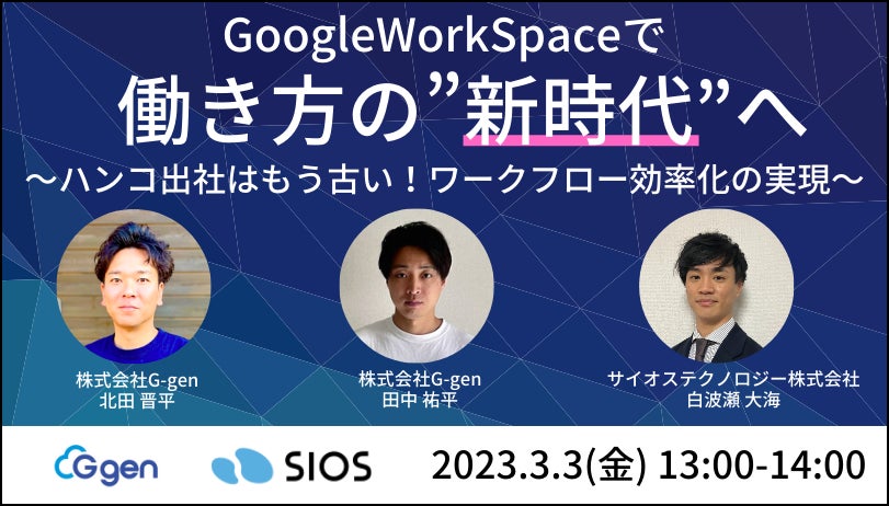 株式会社G-gen(本社:東京都新宿区、代表取締役:羽柴孝)は、サイオステクノロジー株式会社(本社:東京都港区、代表取締役社長:喜多伸夫、以下、サイオステクノロジー)との共催無料ウェビナー「GoogleWorkSpaceで働き方の"新時代"へ 〜ハンコ出社はもう古い!ワークフロー効率化の実現〜」を3月3日(金) 13時より実施いたします。