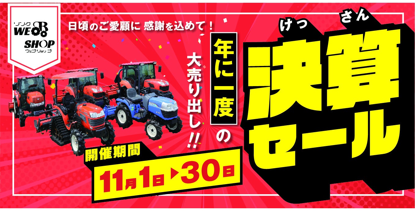 農機具王では、毎年11月に決算セールを開催しております。今年は福島県、栃木県、兵庫県に新店舗が、秋田県には県内2店舗目となる秋田横手店がオープン。合計4店舗の新規オープンにより過去最大の在庫数で豊富なラインナップとなっております。