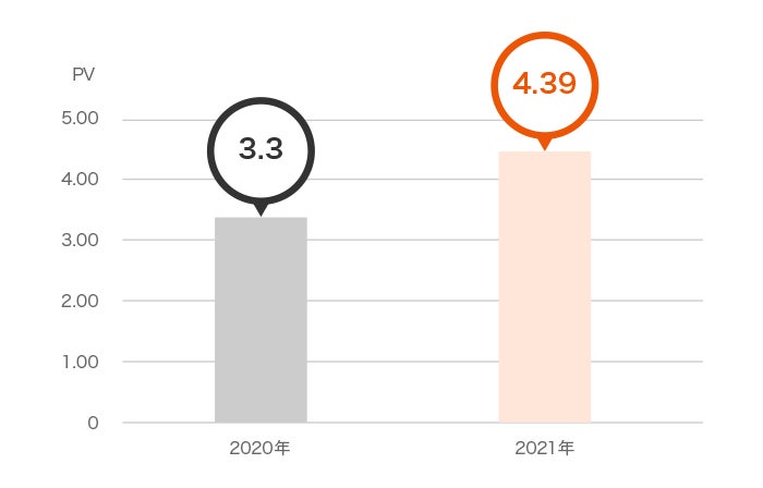 1人あたりのコラム閲覧数は、auのiDeCoウェブサイトに掲載する投資教育コラムの閲覧数を、期間内に当社サイトを訪問した実人数で割ったもの。(日次で算出し年度平均したもの)表の2020年値は2020年4月から2021年3月末まで、2021年値は2021年4月から2022年3月末までを掲載。