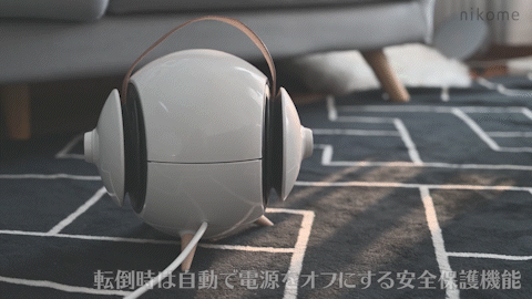 運転中に本体が倒れたら、すぐに電力が遮断され、ファンは50秒くらい回し続けてから、完全停止します。ファンはPTCの熱を下げるための動作になりますので、部品の寿命と安全性を高めています。