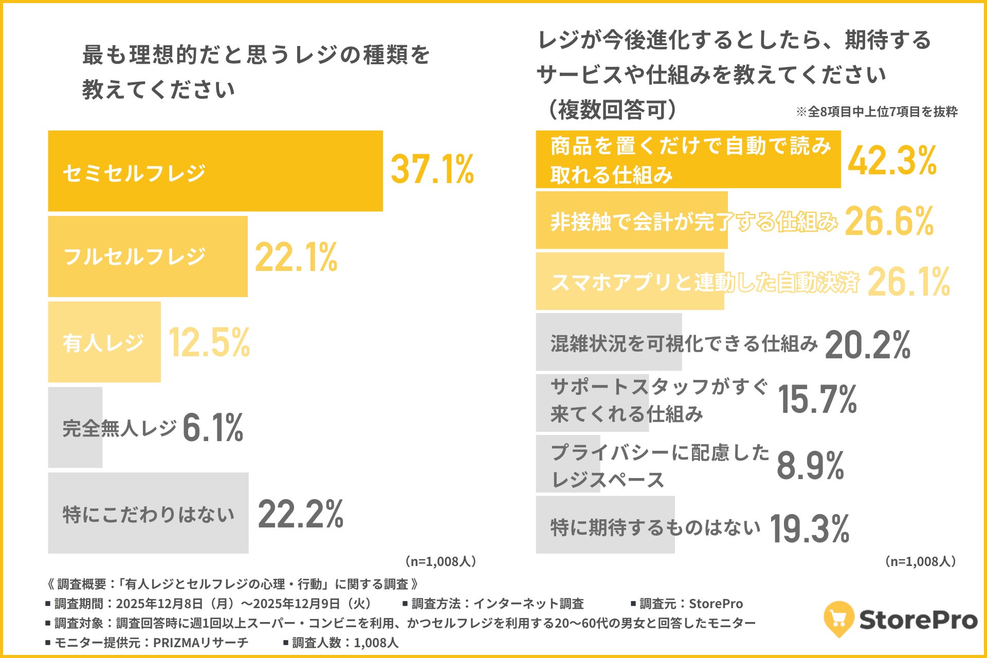 StorePro(所在地:東京都港区)は、週1回以上スーパー・コンビニを利用、かつセルフレジを利用する20~60代の男女を対象に、「有人レジとセルフレジの心理・行動」に関する調査を行いました。