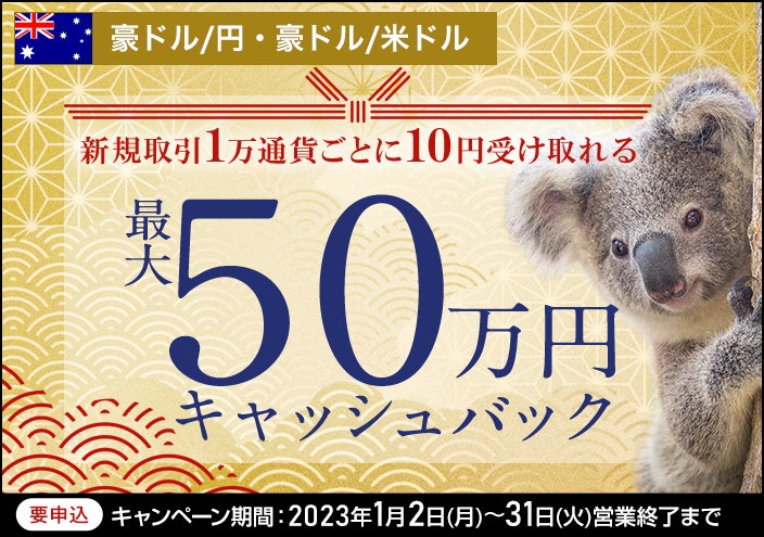 セントラル短資FX株式会社(本社:東京都中央区、代表取締役社長:松田 邦夫)は、2023年1月2日から 31日まで豪ドル/円と豪ドル/米ドルの新規取引を対象としたキャッシュバックキャンペーンを実施します。
