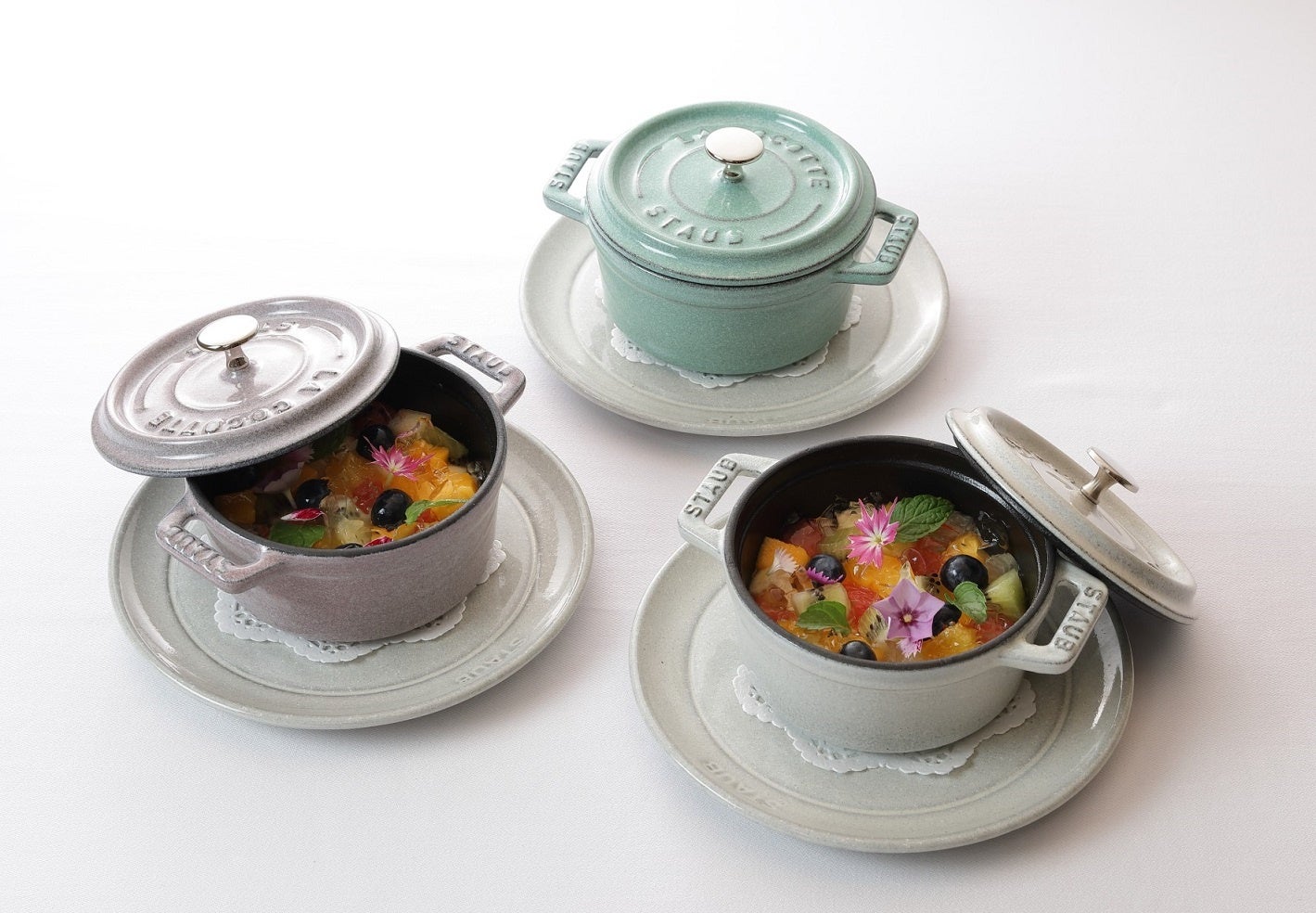 使用するストウブは、お二人の永遠の幸せを願って「ETERNITY Collection(エタニティコレクション)」として展開される人気のカラー「カンパーニュ」「シフォンローズ」「セージグリーン」を中心にセレクト。「セージグリーン」のモチーフとなる「セージ」は、ヨーロッパで古くから“健康”や“家族愛”の象徴として知られています。優しく寄り添うような色合いのストウブが、テーブルを華やかに、そして温かく彩ります。
