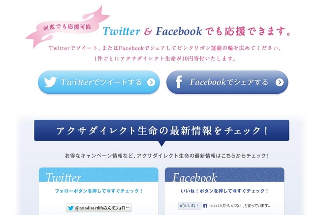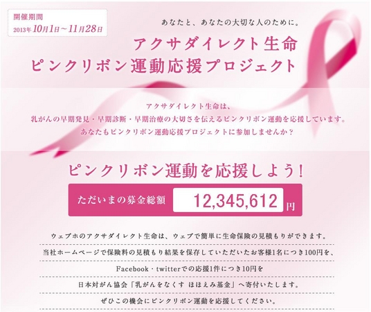 期間中、アクサダイレクト生命の保険料見積もり結果を保存された方1名につき100円を、また、ツイッターおよびフェイスブックによるピンクリボン運動に関するメッセージの発信1件につき10円を、アクサダイレクト生命が日本対がん協会「乳がんをなくす ほほえみ基金」へ寄付します(メッセージの発信による寄付にあたっては、本プロジェクトサイトを経由する必要があります)。