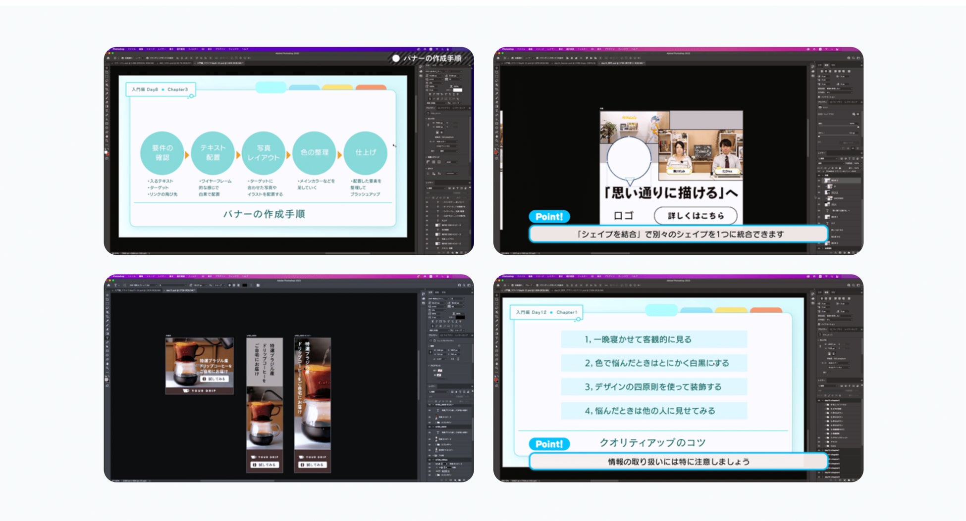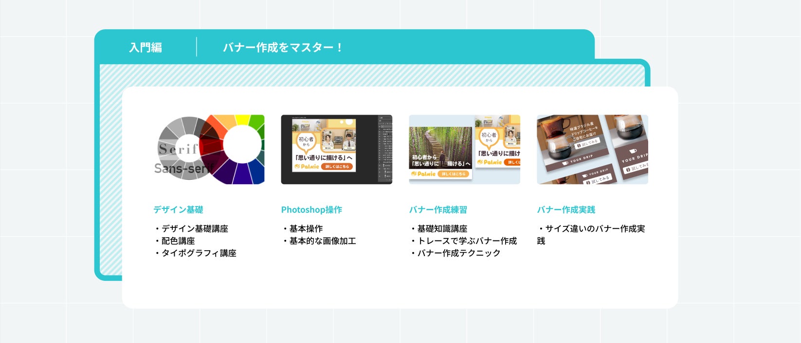 例えば『入門編』では、デザインの基礎やPhotoshop操作を学んだ上で、バナー作成に関する基礎講座や練習講座等を受講していき、最終的に自分の力でバナー作成を実践し、スキルをマスターすることが出来ます。