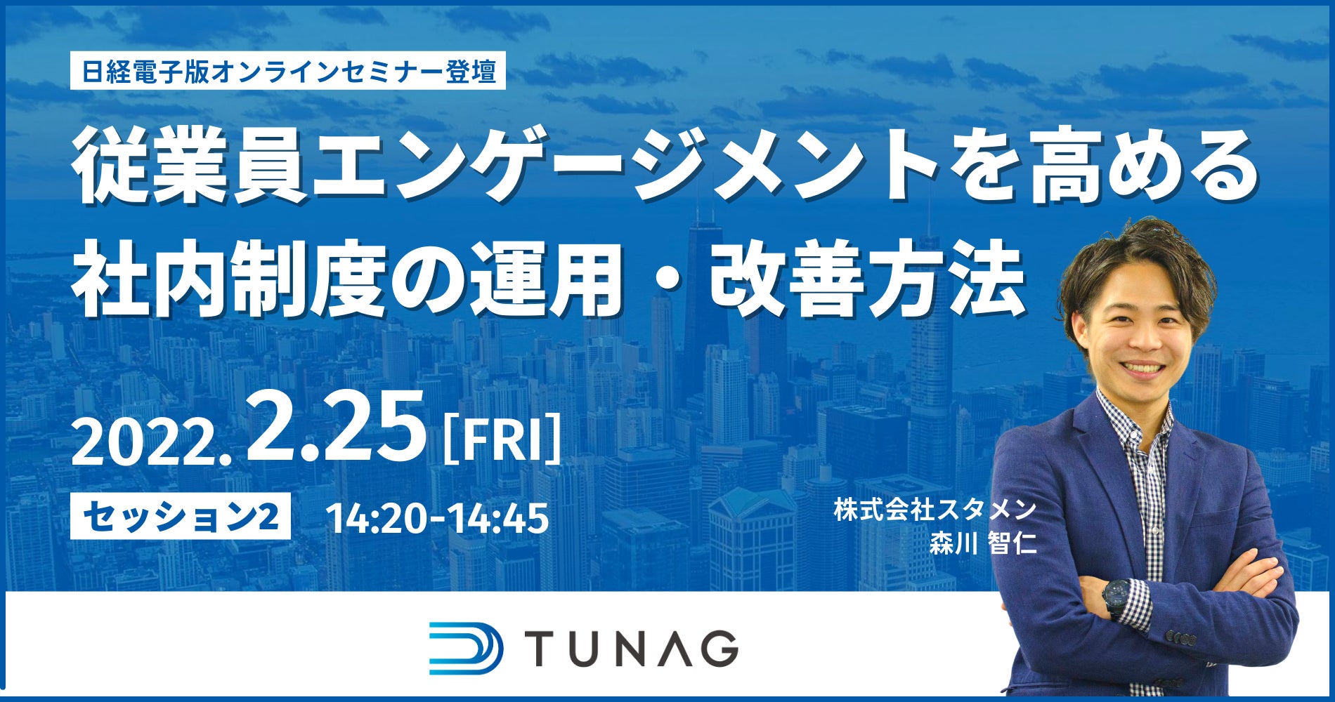 エンゲージメント経営プラットフォーム「TUNAG(ツナグ)」を提供する株式会社スタメン(本社:愛知県名古屋市 代表取締役社長:加藤 厚史 以下、スタメン)は、株式会社日本経済新聞社(本社:東京都千代田区、代表取締役:長谷部剛、以下日経新聞)が主催する日経電子版オンラインセミナー『従業員エンゲージメントの高い組織の実現へ~新しい時代を勝ち抜くための人財力強化~』にTUNAG事業部カスタマーサクセス部部長の森川 智仁が登壇することをお知らせいたします。