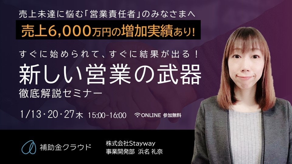 株式会社Staywayは、「新しい営業の武器」を手に入れたい事業者様に向け、補助金・助成金の営業への活用方法をご案内する無料のWebセミナーを開催いたします。