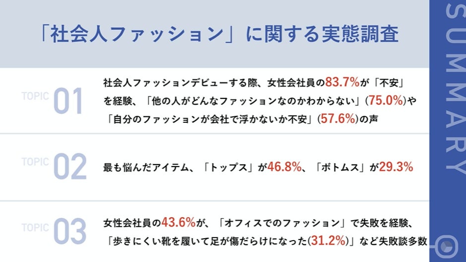 - 社会人ファッションデビューする際、女性会社員の83.7%が「不安があった」と回答