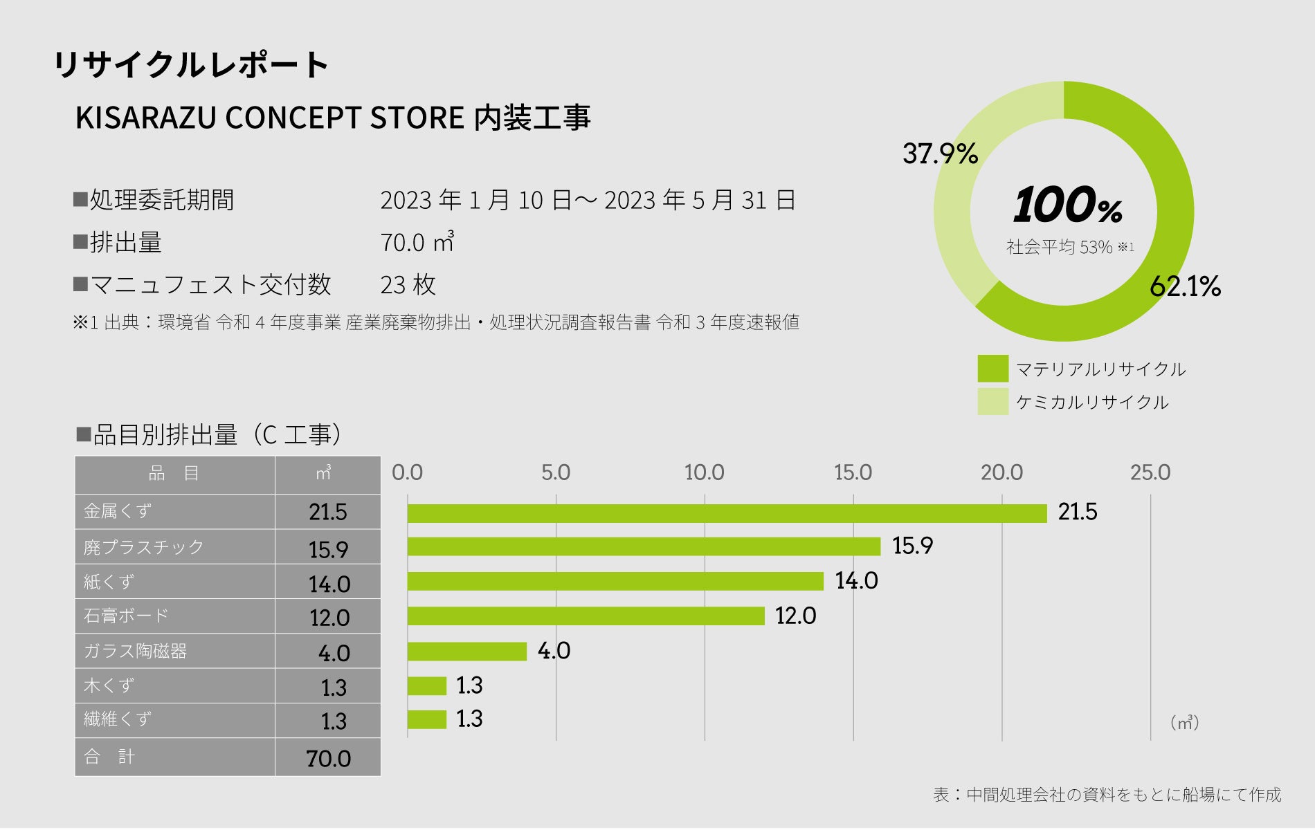 船場は、工事で排出される廃棄物を計画的に管理し、従来数値化が難しかった中間処理以降のトレーザビリティを丁寧に行うことにより、リユース、リサイクルのネットワークを構築し、できる限り廃棄物を出さない内装工事を行っています。「KISARAZU CONCEPT STORE」は、サステナビリティに特化した施設であることから、船場は、中間処理会社との連携のもとゼロウエイストを目指し、内装工事で発生する廃棄物のリサイクル率100%を達成しました。