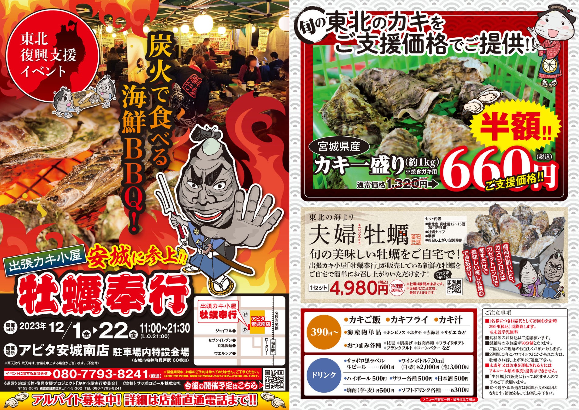 震災後不振に悩まされた宮城県の主力産業である養殖業者支援を目的とした『かき小屋実行委員会』。今回は<アピタ安城南店>駐車場での限定開催。自分で焼くBBQスタイルの特設会場で、地域活性化と復興支援を推進。