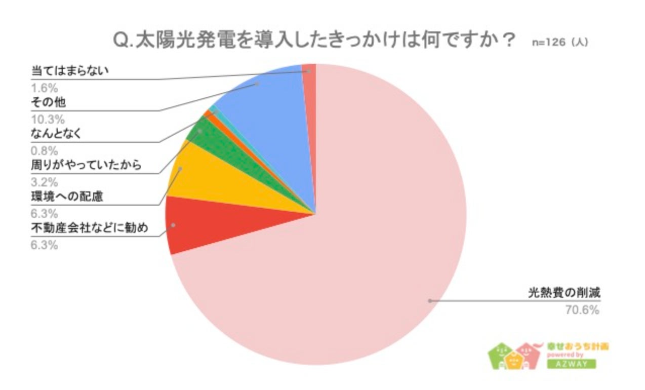 続いて、太陽光発電を導入している126人に「太陽光発電を導入したきっかけ」について聞いたところ、「光熱費の削減」が1位で89人(70.6%)、「不動産会社などの紹介」と「環境への配慮」が同率2位で8人(6.3%)という結果になりました。光熱費の削減を目的として太陽光発電を導入した人が多いことがわかります。