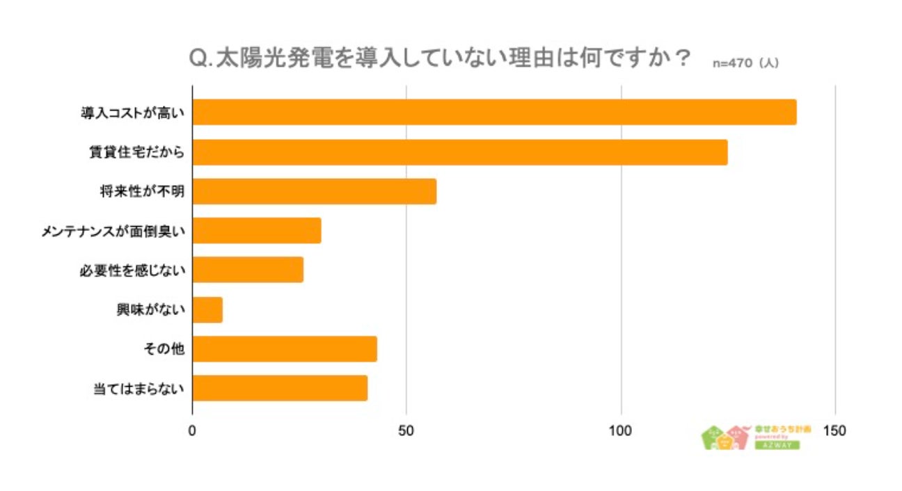 また、太陽光発電を導入していない人470人に「導入していない理由」について聞いたところ、「導入コストが高い」が1位で141人、「賃貸住宅だから」が2位で125人、「将来性が不明」が3位で57人という結果に。太陽光発電を導入した人たちも気にしていた「導入コスト」が最もネックになっており、補助金のような積極的な負担軽減策が求められています。