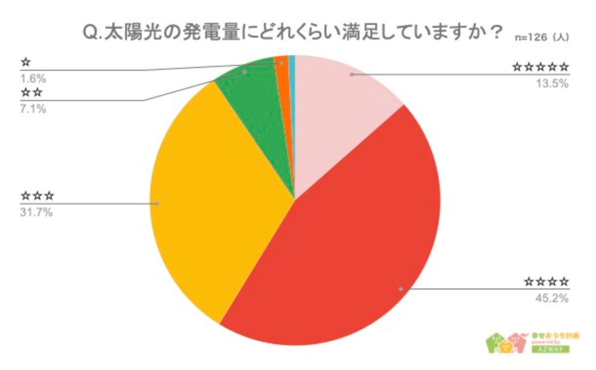 また、導入の結果「太陽光発電の発電量に満足しているか」について聞いたところ、星4つが最も多く57人(45.2%)、星3つが40人(31.7%)、星5つが17人(13.5%)という結果に。光熱費の削減を目的として導入した人が多かった太陽光発電ですが、約6割の人が星4つ以上の満足度を示しています。