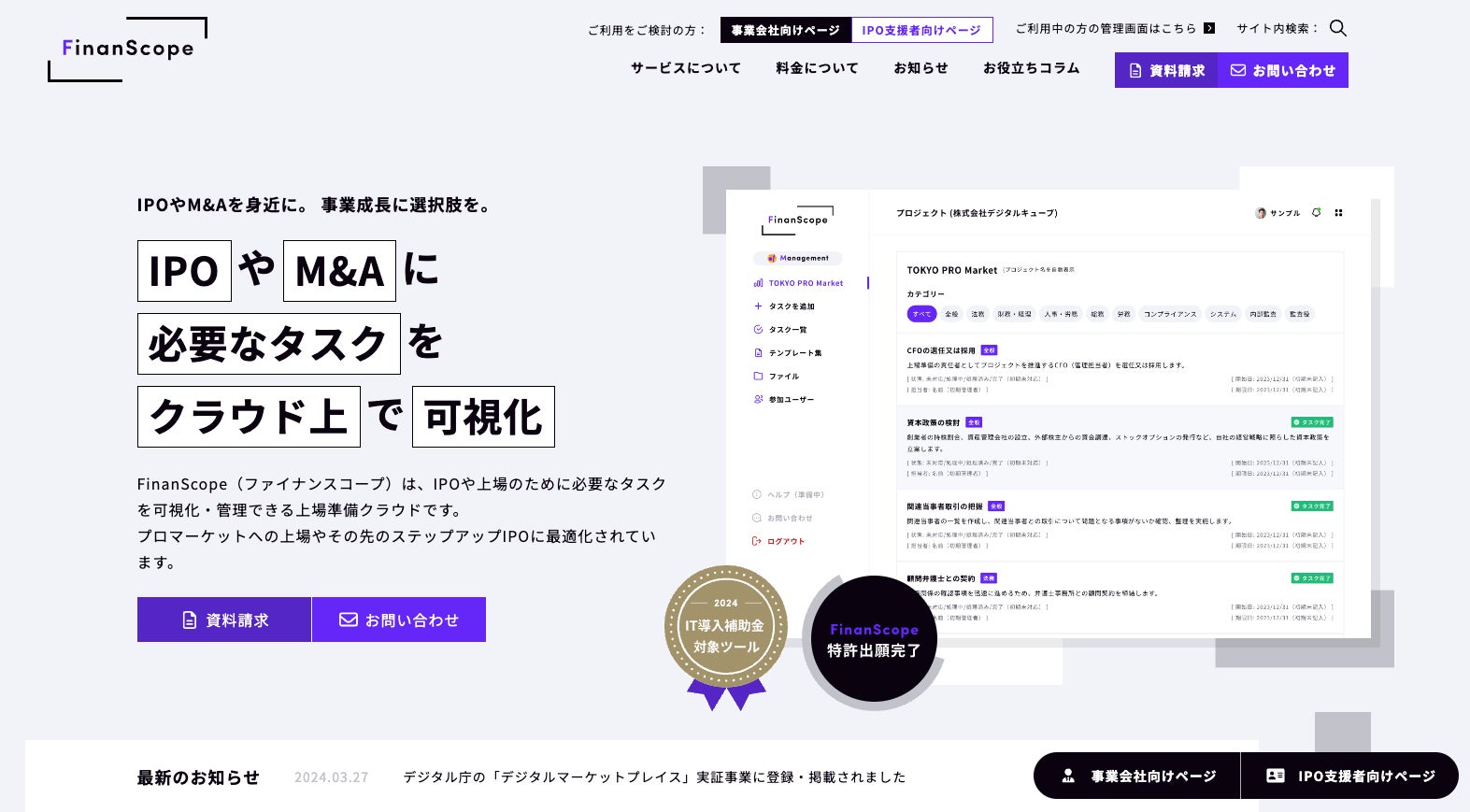 FinanScopeは、上場・IPOを目指す企業向けのクラウドサービスです。タスク管理、ドキュメント作成、スケジュール管理など、上場準備に必要な機能を一元化し、効率的なプロジェクト管理を可能にします。